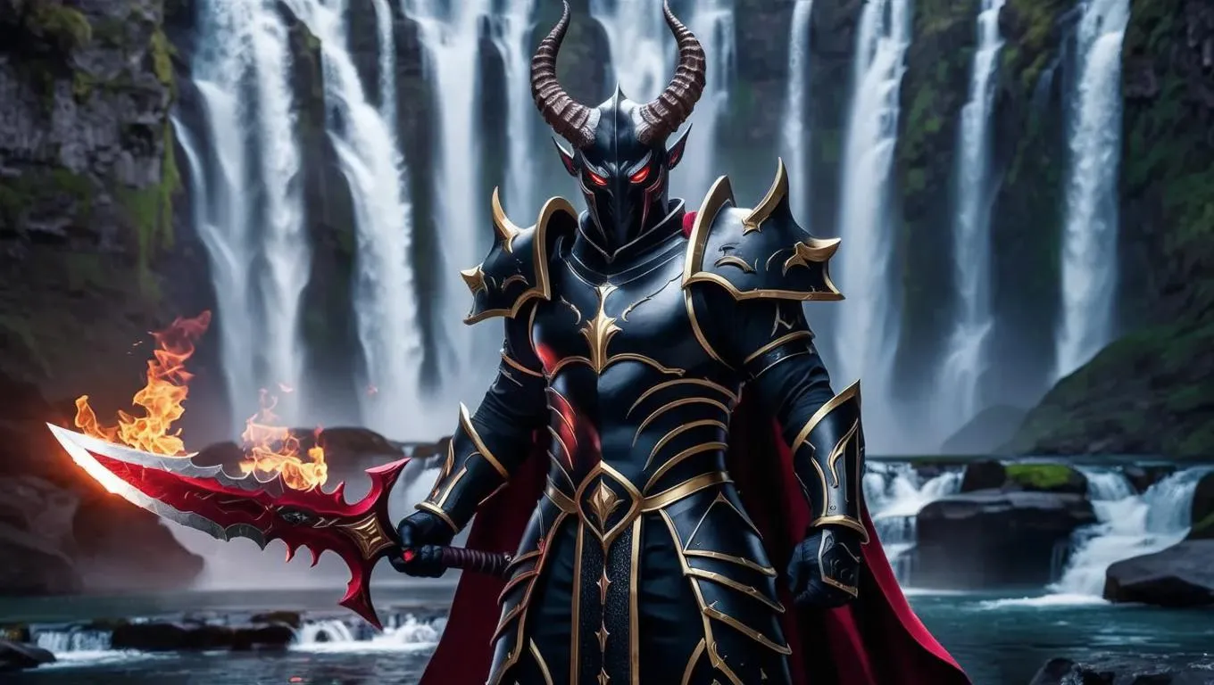 Create a terrifying AI-generated demon knight with glowing red eyes and black-gold armor, wielding a flaming blade before a cascading waterfall. VivaGo AI crafts this hellish warrior with fiery horns, menacing aura, and cinematic lighting for dark fantasy art, game characters, or horror-themed HD visuals using advanced AI tools.