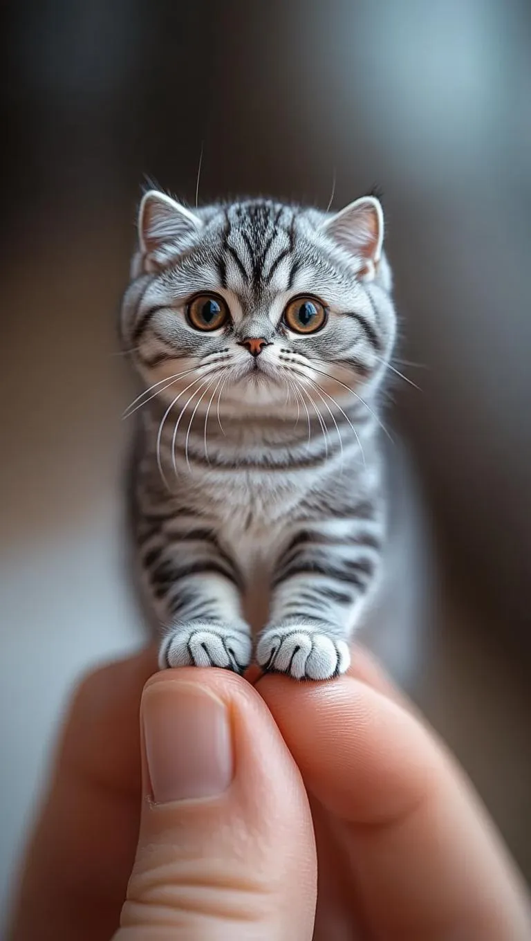 Create stunning AI-generated images of a miniature Gray Scottish Fold cat perched on fingers. Highlight intricate fur textures, soft shadows, and shallow depth of field for lifelike detail. Background blur enhances focus on the tiny, finger-sized feline, showcasing its unique charm. Perfect for AI-powered creative projects with professional-grade realism—explore Vivago.ai’s tools for captivating visual content.