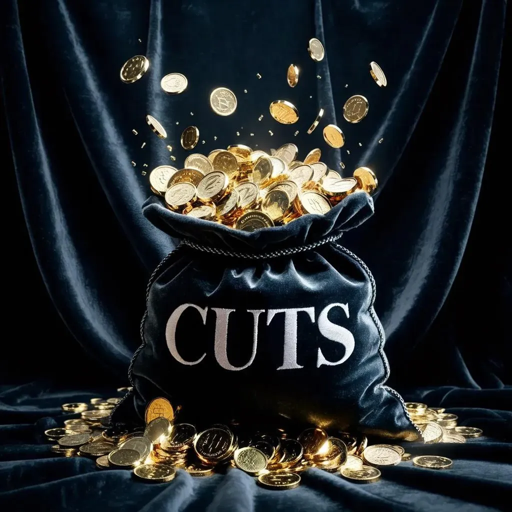 Generate striking AI visuals of a bag of money featuring bold "cuts" text on a sleek black background. Ideal for financial themes, this high-contrast image merges text prompts with vivid AI effects. Create professional-grade visuals effortlessly using VivaGO's advanced editing tools. Perfect for impactful content on budgeting, economics, or creative financial storytelling.