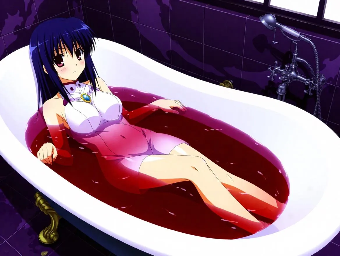Generate striking AI art of Rei Ayanami immersed in a bathtub filled with maroon water using vivago.ai. Elevate anime-inspired visuals with eerie, surreal aesthetics and professional-grade AI tools for unique character scenes, vibrant color contrasts, and high-quality creative transformations.