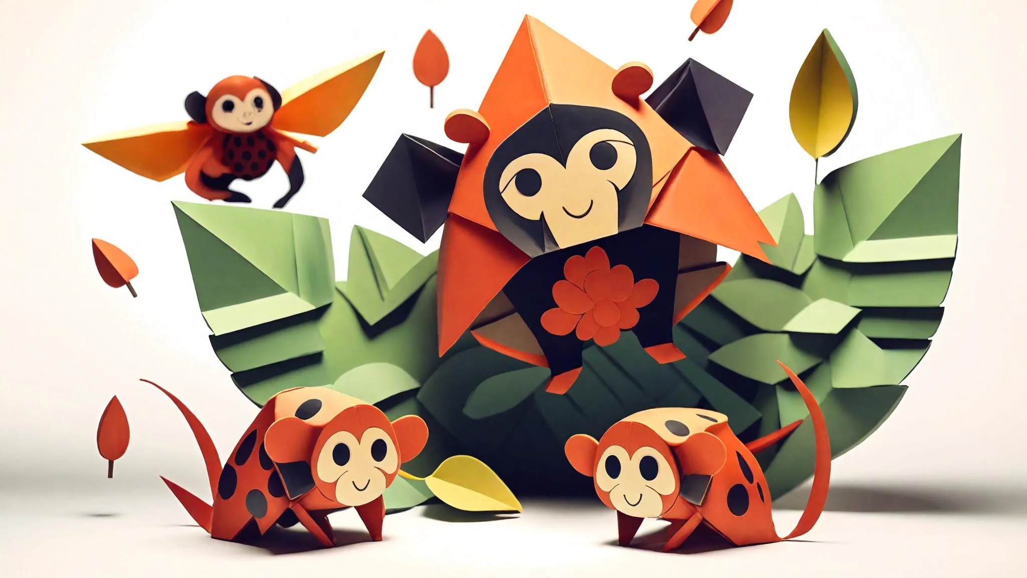 Experience origami-inspired AI art featuring a determined ladybug learning to fly amidst curious monkeys in a lush jungle. Vivago.ai transforms whimsical concepts into paper-craft animations with vibrant textures and dynamic movement. Create playful wildlife scenes with AI-powered origami effects for captivating, stylized digital storytelling.