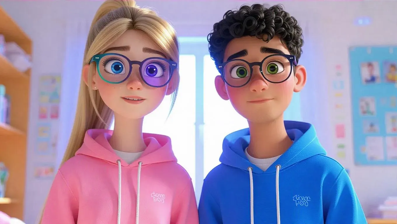 Create vibrant AI-generated Pixar-style scenes with vivago.ai. Transform text into animated visuals of Hlektra and Dimitris, 16-year-olds in colorful hoodies, magic glasses, and vibrant lenses. Capture their excitement, curiosity, and youthful energy through dynamic AI effects, perfect for storytelling or artistic projects. Professional-grade tools for lifelike animations, detailed outfits, and expressive characters.