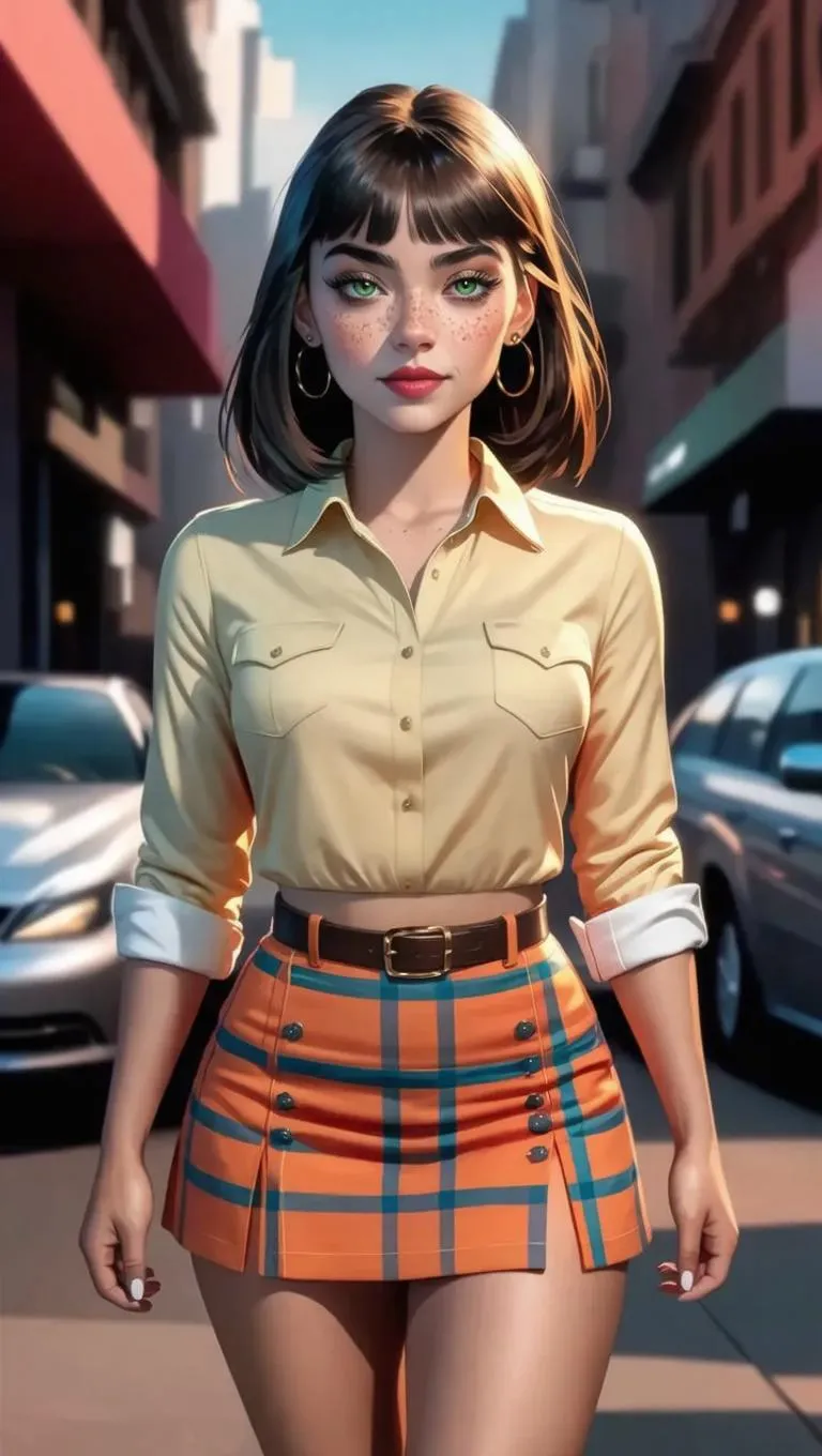 Create a vibrant AI-generated cartoon hero with green eyes, freckles, and long brown hair. Design detailed comic book-style characters in plaid skirts and pastel sweaters using vivago.ai's AI art tools for professional-grade illustrations and dynamic visual storytelling.