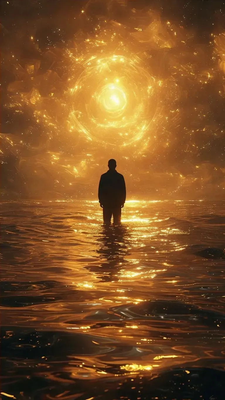 Witness a hauntingly cinematic scene: a man gazes at a spectral figure in tranquil waters. AI-generated 3D rendering blends oil painting textures, warm lighting, and dramatic depth for an eerie yet serene visual. Elevate storytelling with vivago.ai's AI effects, merging supernatural mystery and artistic realism.