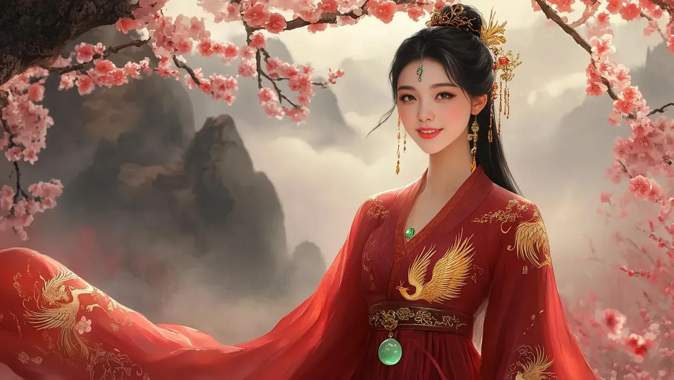 Create ethereal Chinese-style visuals with AI: A Tang Dynasty maiden in crimson phoenix-embroidered Hanfu amidst swirling peach blossoms. Cinematic composition blends historical elegance with fantasy elements - misty ink-wash mountains, warm saturated hues, and painterly textures. Perfect for vibrant animations, cultural storytelling, or romantic scenes merging traditional aesthetics with AI-powered creativity.
