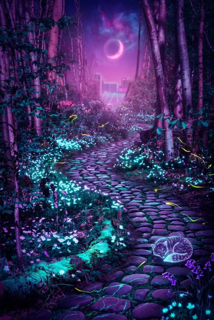 Depict me a beautiful night forest based on the reference photo attached. It has a cobbled path running amongst the biolumicent flowers while fireflies flitter amongst the darkened underbrush. The whole scene has a Synthwave asthtetic to it as if the whole scene belongs in someone's dream.