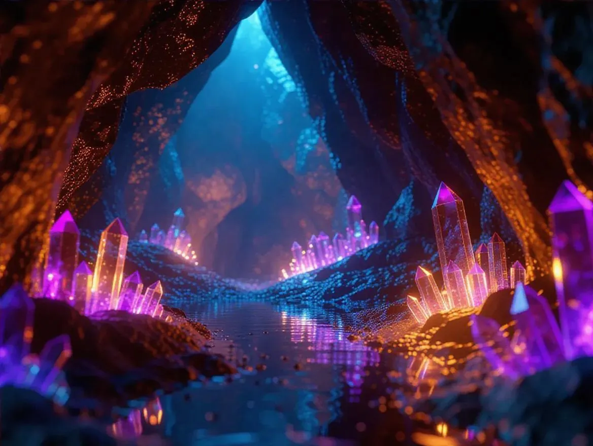 3D animation style, crystal cave, walls covered in shimmering crystals, flashes of light, sparkling glitters, magical aura, ethereal glow, intricate formations, vibrant colors, otherworldly atmosphere.