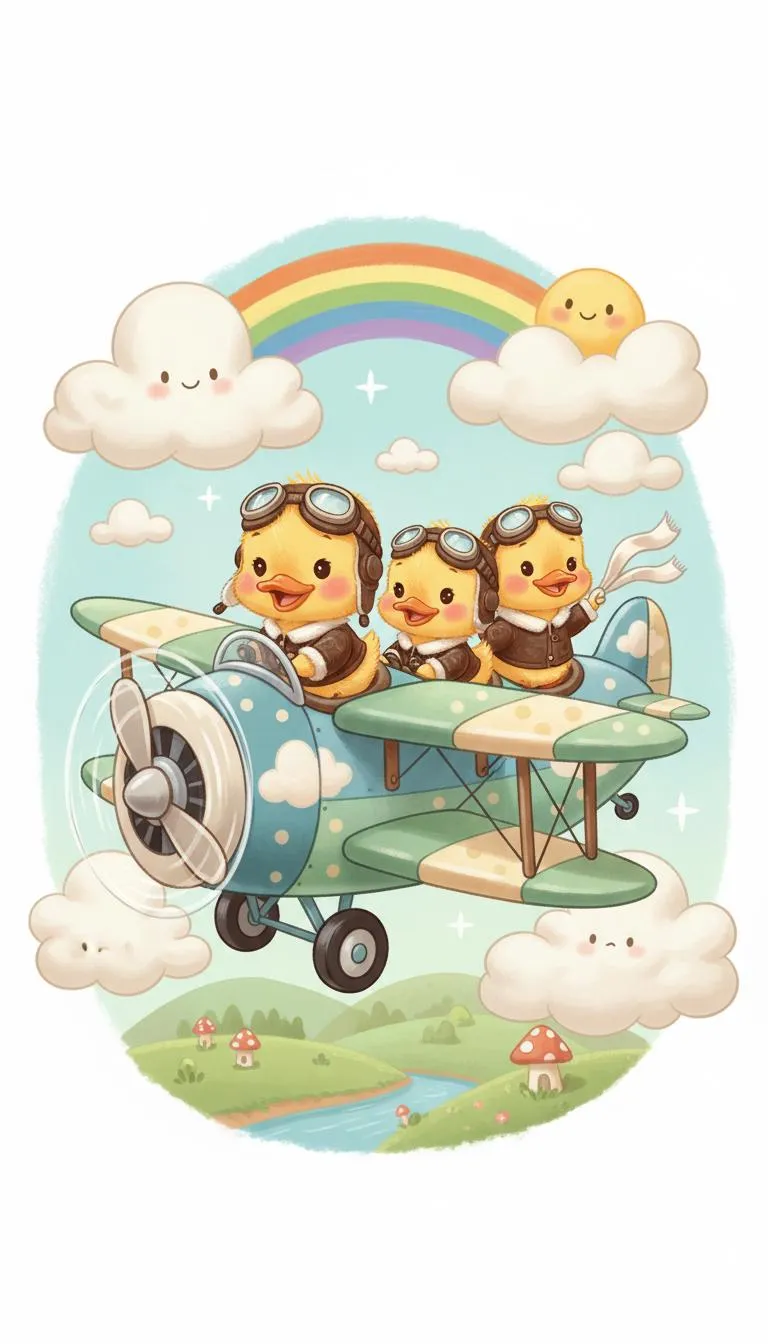 Create AI-generated cartoon illustrations of three adorable ducks flying in a charming small airplane. Generate this whimsical visual content with vivago.ai's powerful AI tools for stunning, professional-grade results. Transform your text prompts into captivating cartoon art effortlessly.