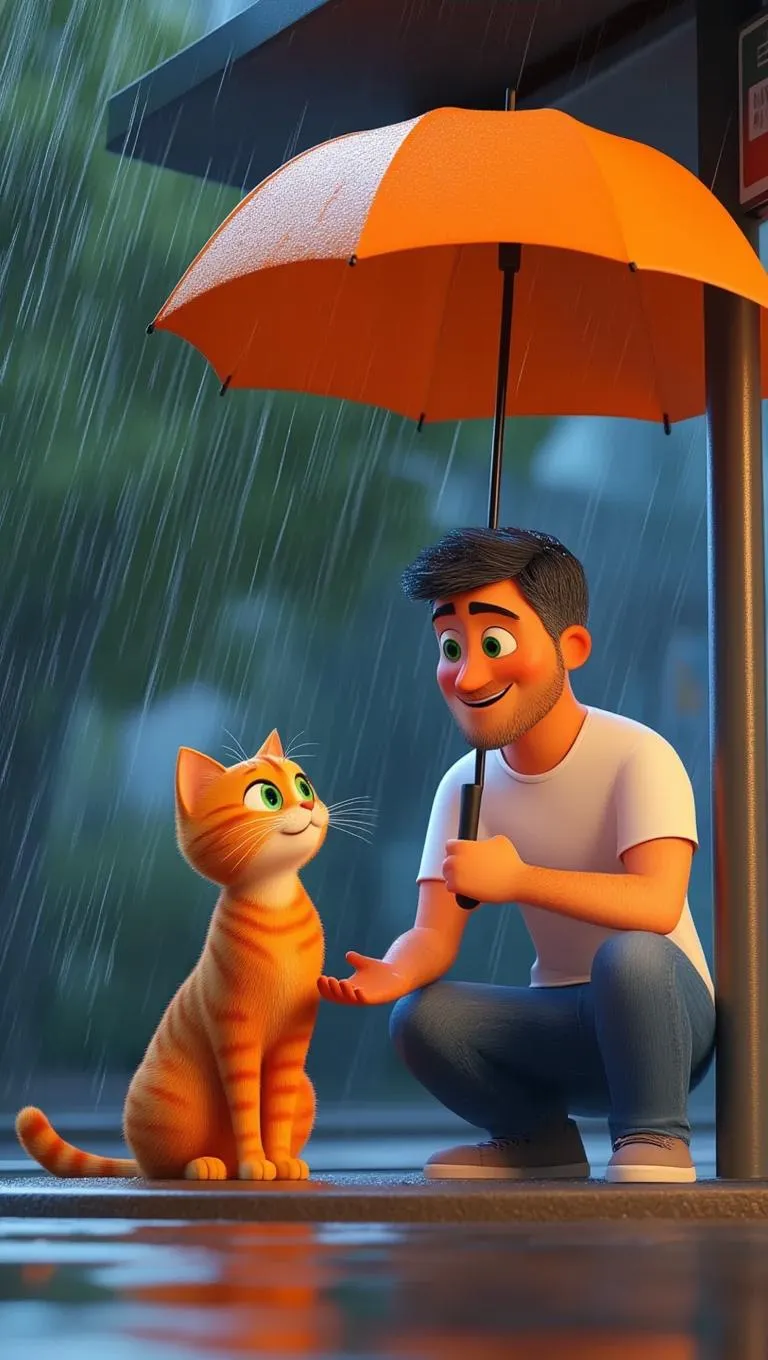Generate AI-powered 3D cartoon animation of a kind elderly man in rain offering help to a hesitant orange tabby cat under a bus stop. Features realistic rain effects, expressive greenish-yellow-eyed cat, detailed character design (white T-shirt, jeans), and warm emotional storytelling for professional visual projects.