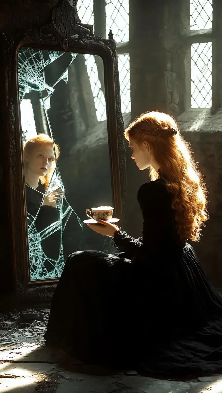 Create haunting AI-generated art of Edith in a medieval castle, her blonde hair glowing as she gazes at a shattered soul-trapped mirror holding her redheaded father's spirit. Vivago.ai transforms text into vivid scenes—black dresses, eerie atmospheres, and emotional storytelling—using advanced AI image tools for professional-grade fantasy visuals.
