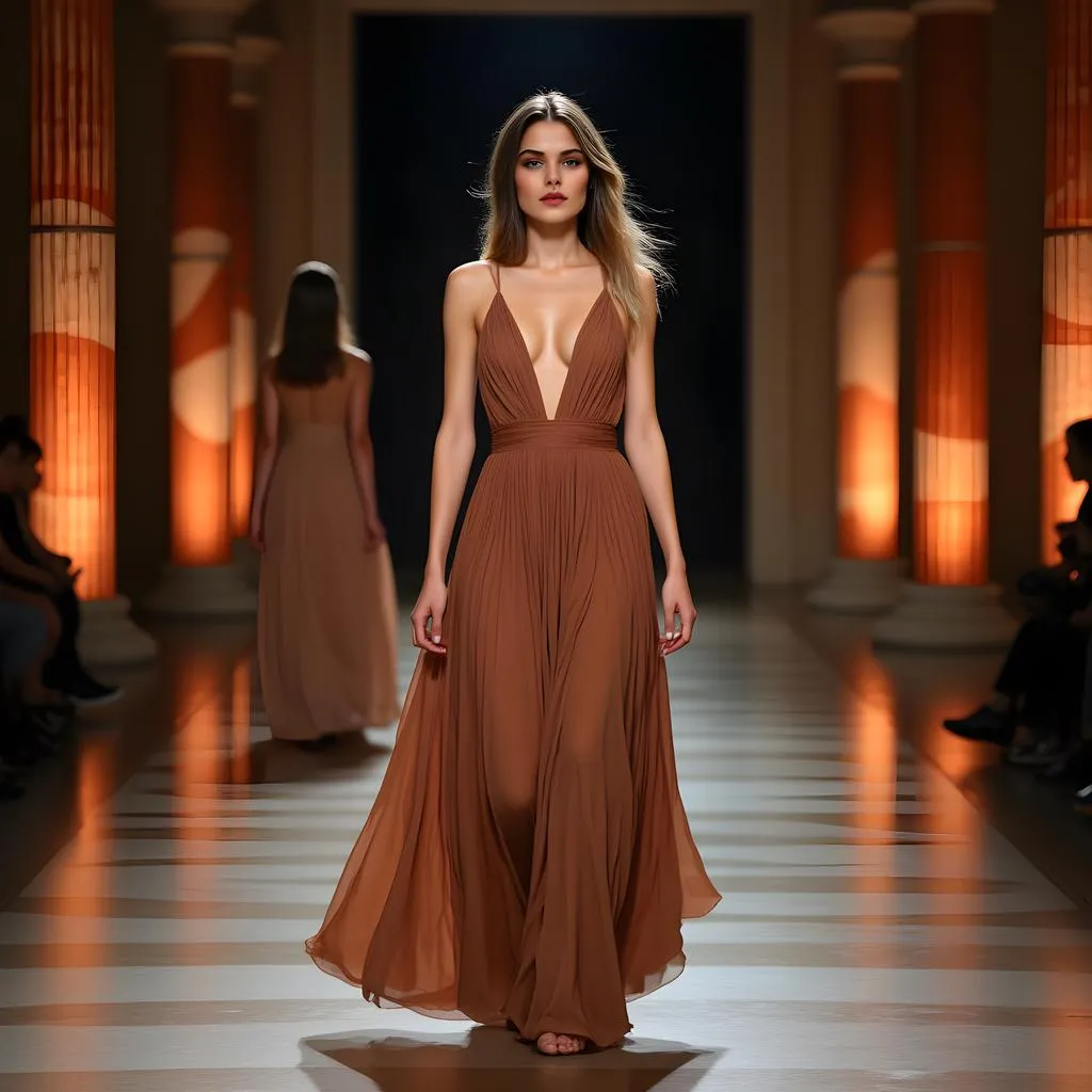 Experience AI-generated visuals of Greek supermodels in modern chiffon dresses inspired by ancient pottery, strutting a grand Athenian temple runway with Doric columns, warm torchlight ambiance, and glossy terracotta floors—merging classical art motifs with avant-garde fashion for timeless, museum-worthy elegance.