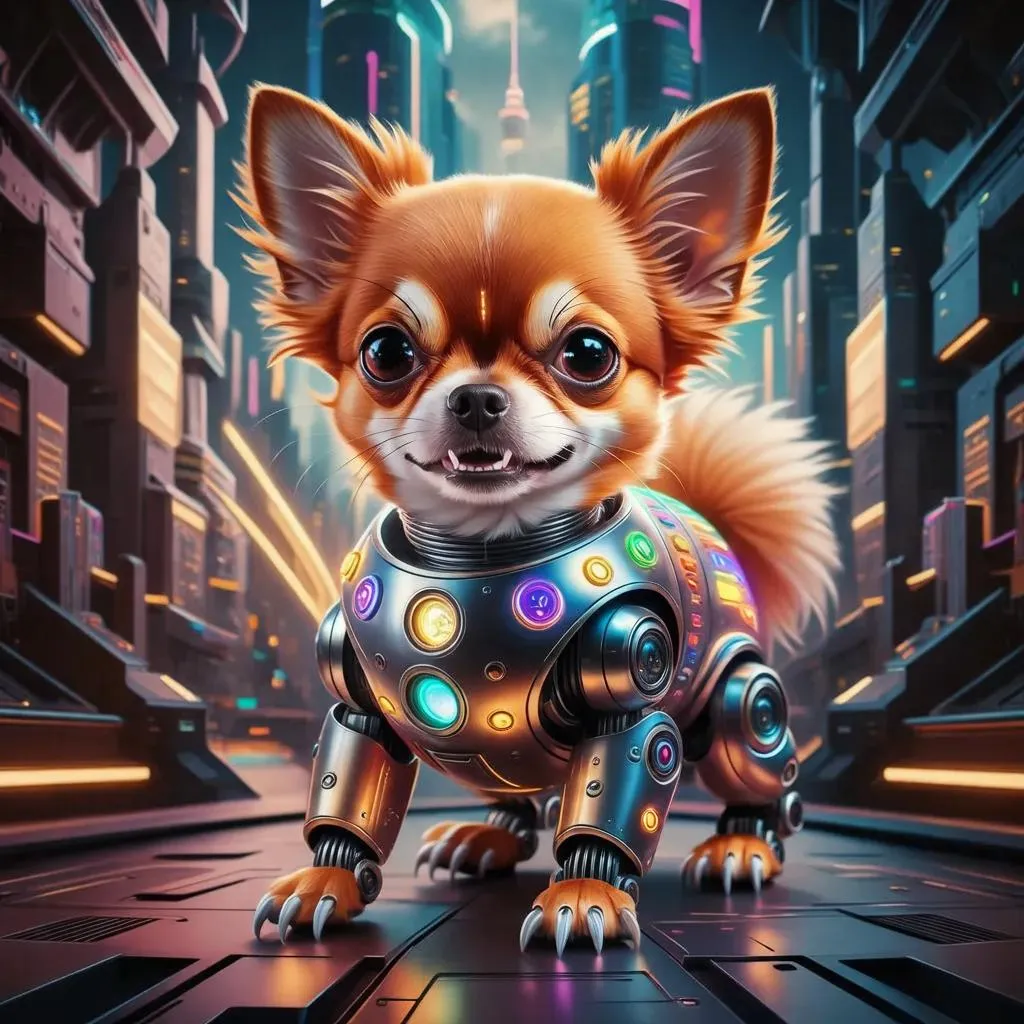Create a vibrant AI-generated robot chihuahua with a furry orange head, metallic body, colorful control buttons, and sharp claws. Highlight glowing eyeballs for futuristic flair. Ideal for sci-fi art or pet-tech concepts. Use Vivago.ai's AI image tools to craft unique robotic-animal hybrids with dynamic textures and neon accents. Transform prompts into eye-catching digital visuals instantly.