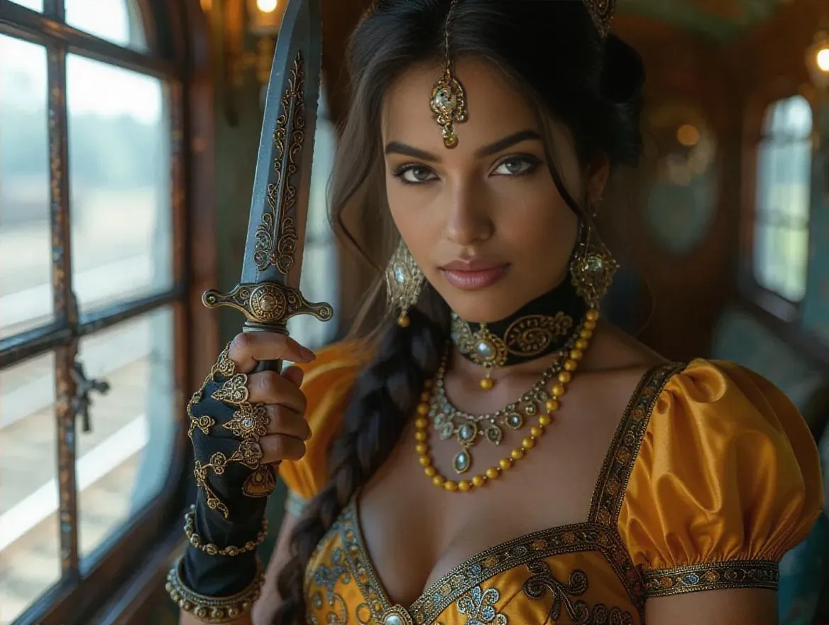 Create AI-generated steampunk photography of a smirking Indian woman in ornate yellow-adorned attire aboard a vintage train, wielding a detailed knife. Perfect for edgy fantasy art, retro-futuristic visuals, and avant-garde digital storytelling with vivago.ai's advanced image generation tools.