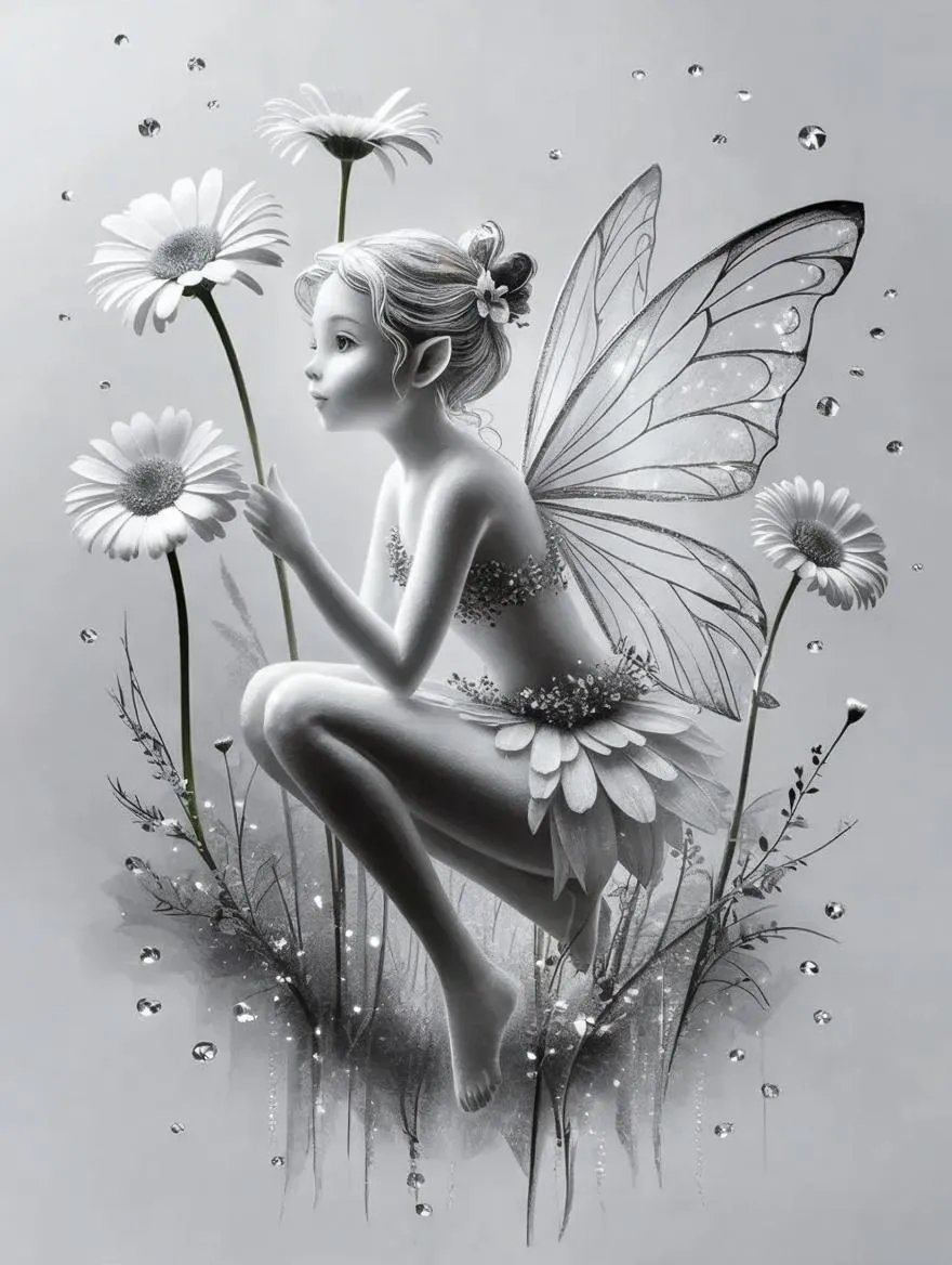 Create stunning AI-generated black-and-white fairy art with delicate daisy details and soft contours. Experience ethereal shimmering fogged-glass effects on white backgrounds using ultra-high-definition 16k resolution AI image generation tools for professional-grade artistic results.