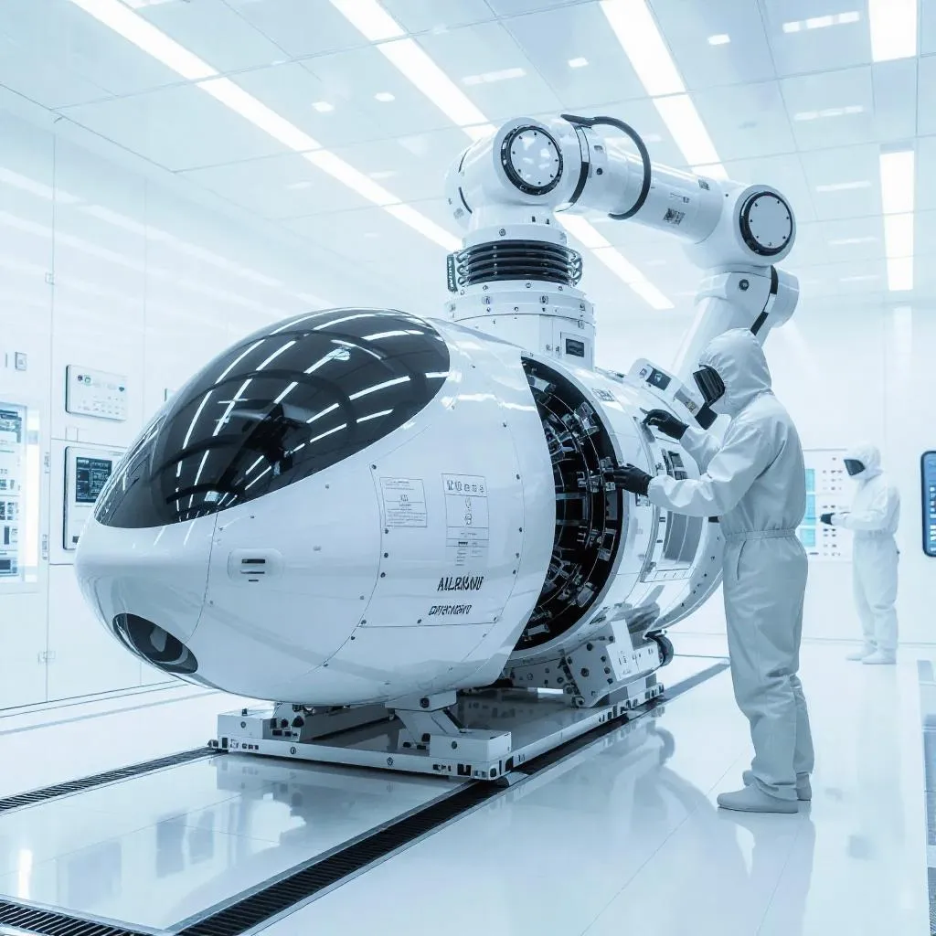 Generate a futuristic lab scene with AI: white capsule spacecraft under robotic manipulators in a sterile hangar. Features technician in protective suit, advanced tech panels, and crisp lighting. Transform prompts into high-tech visuals with Vivago.ai's AI image tools for professional-grade sci-fi environments.