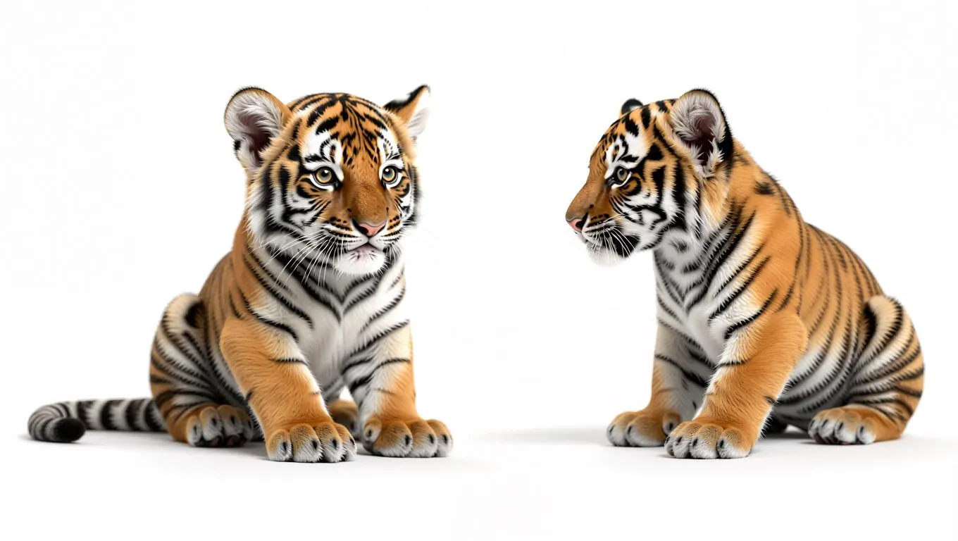 Generate photorealistic baby tiger images with our AI tool. Ultra-detailed miniature tiger cub in 4K - sitting front, playful side, and back views. White background, shallow depth of field, 85mm lens effect. Rendered in Unreal Engine. Perfect soft fur texture and realistic anatomy. Create professional AI-generated images effortlessly on VIVAGO.AI.