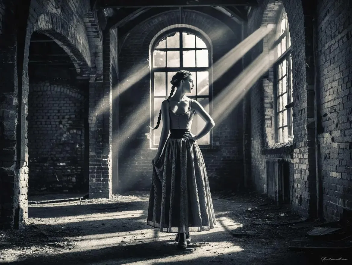 Generate striking black & white vintage photography with AI. Craft atmospheric scenes featuring dramatic shadows, arched windows, and rustic brick interiors. Highlight nostalgic female figures in flowing skirts, braided hair, and moody high-contrast lighting. Add film grain texture for timeless artistry using Vivago.ai’s AI image tools. (57 words)
