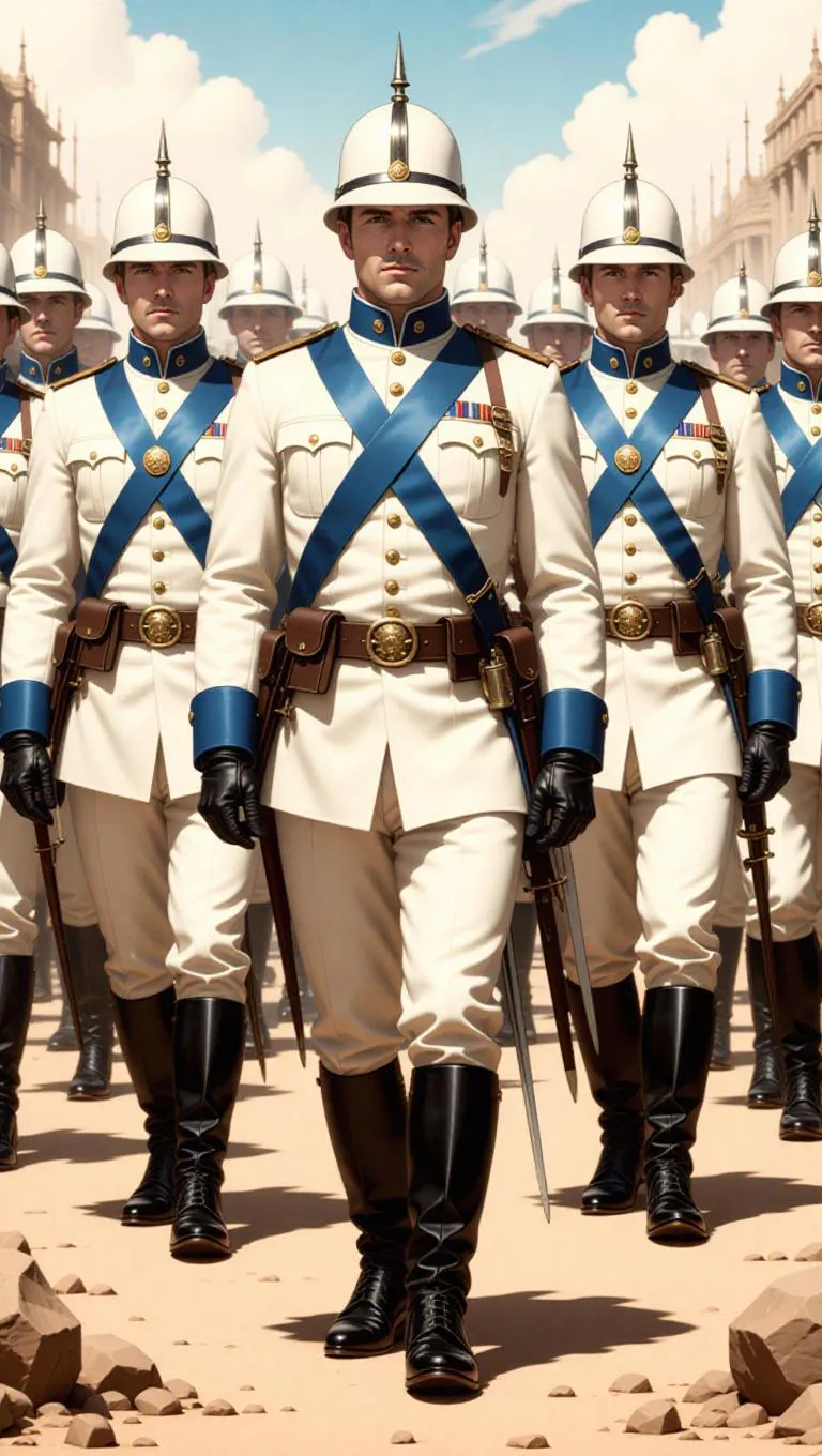 Create AI-generated anime-style illustrations of 19th-century Italian colonial troops in authentic uniforms—white tunics, blue sashes, visored helmets, and ceremonial swords. Depict weary soldiers burdened with heavy gear using Vivago.ai's AI art tools for historically accurate, vivid visual storytelling and professional-grade creative results.