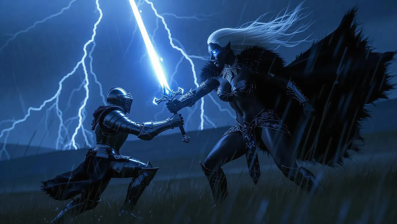 Vivago.ai crafts epic AI visuals: fierce dark elf barbarian with glowing eyes, white hair, and black fur bikini battles a knight in silver armor under a stormy night sky. Transform text into dynamic scenes with lightning effects, dramatic contrasts, and professional-grade imagery using AI-powered creative tools for striking fantasy art.