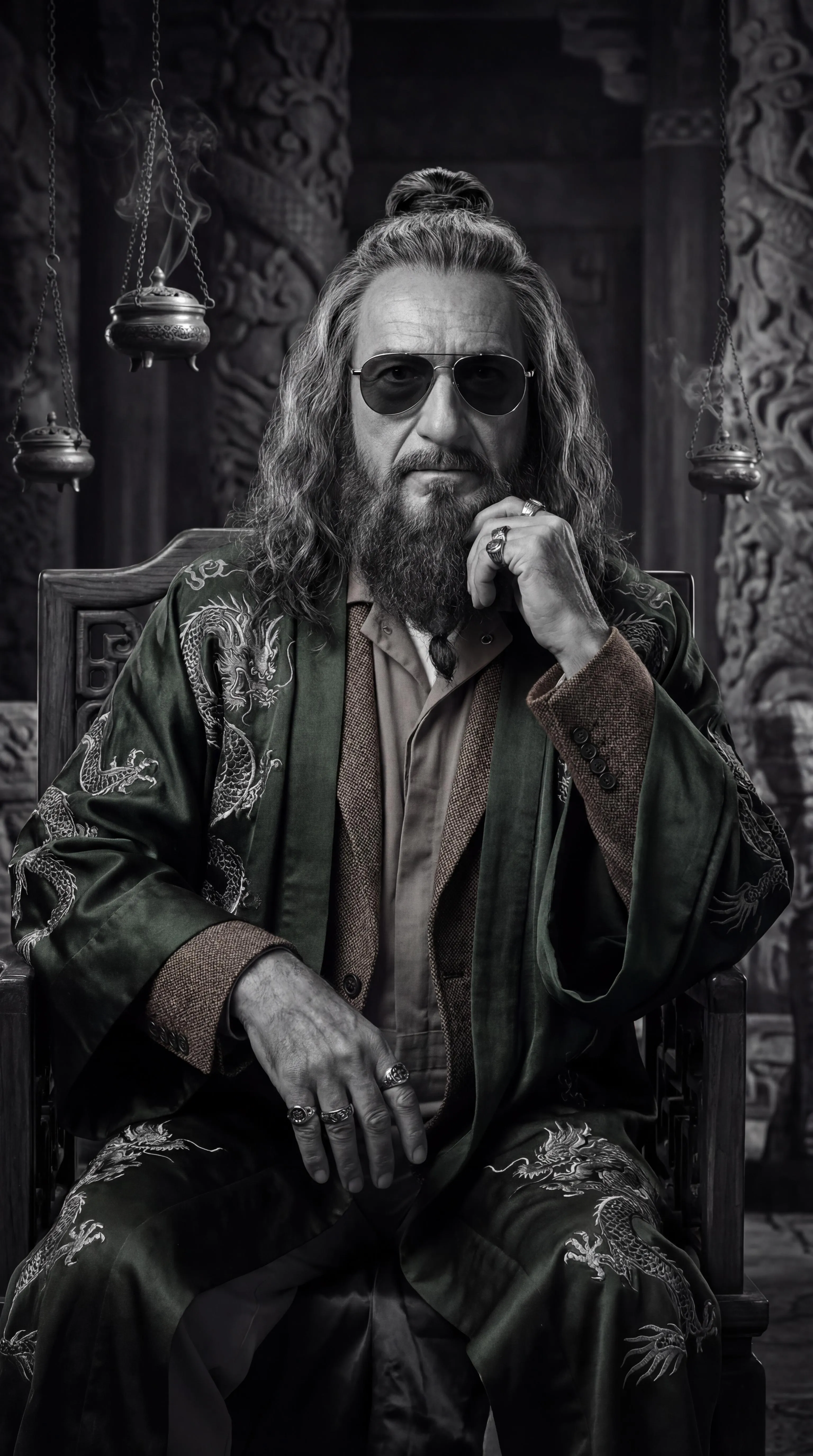 Generate stunning AI art of Ben Kingsley as Trevor Slattery. See all his iconic MCU looks merged: Shang-Chi dragon robe, Iron Man 3 warlord suit, Wonder Man jacket, and All Hail the King jumpsuit. Features ten rings, sunglasses, goatee, in a monochrome composite. Create this unique Marvel character mashup with Vivago's AI art generator.