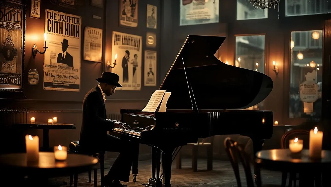 Immerse in a moody noir ambiance with our AI-generated scene of a pianist in a vintage cafe. Elevate creative projects with cinematic visuals crafted from text prompts. Explore AI-powered noir effects and editing tools for evocative, professional-grade imagery.
