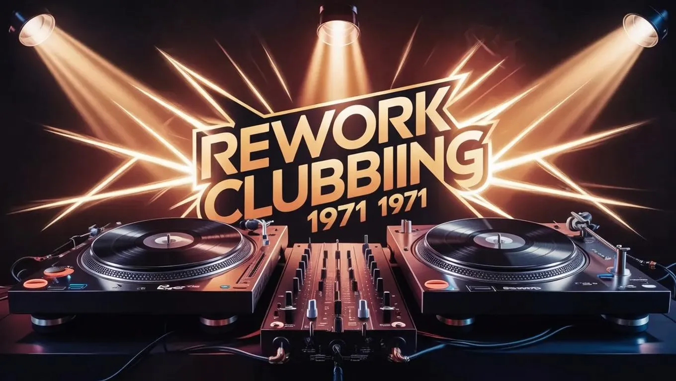 Create a custom DJ REWORKCLUBBING1971 logo with vintage turntables, dynamic spotlights, and retro club vibes. Crafted by Vivago.ai's AI tools for professional, eye-catching music branding. Perfect for capturing 1970s DJ aesthetics with vinyl records and turntable motifs in AI-generated logo design.