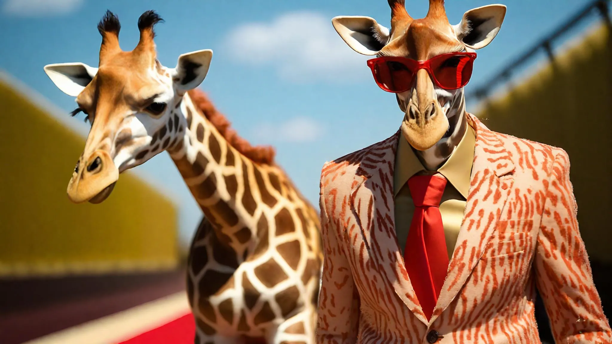 Create a snazzy giraffe in stylish dark glasses walking a lit runway with Vivago.ai's AI image generator. Transform text prompts into vibrant animal fashion visuals, crafting unique suits and red-carpet moments with professional AI effects and editing tools. Elevate creativity effortlessly.
