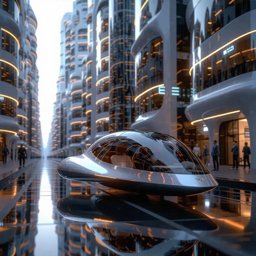Futuristic European metropolis AI-generated imagery: photorealistic panorama of sleek skyscrapers blending organic curves and sharp geometry. Glass-metal facades reflect light, towering over wide streets with silent hovercraft transports featuring silver bodies and transparent cabins. Vibrant cityscape combines cutting-edge architecture with eco-friendly mobility for next-gen urban realism.