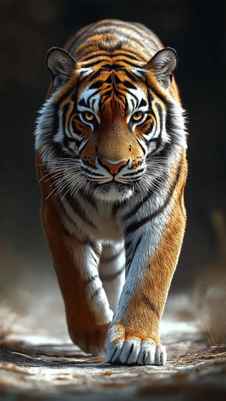 Generate a hyperrealistic AI image of a tiger walking in close-up front view with a seamless background using vivago.ai. Perfect for wildlife projects, this AI-powered tool crafts lifelike visuals and professional edits with precision.