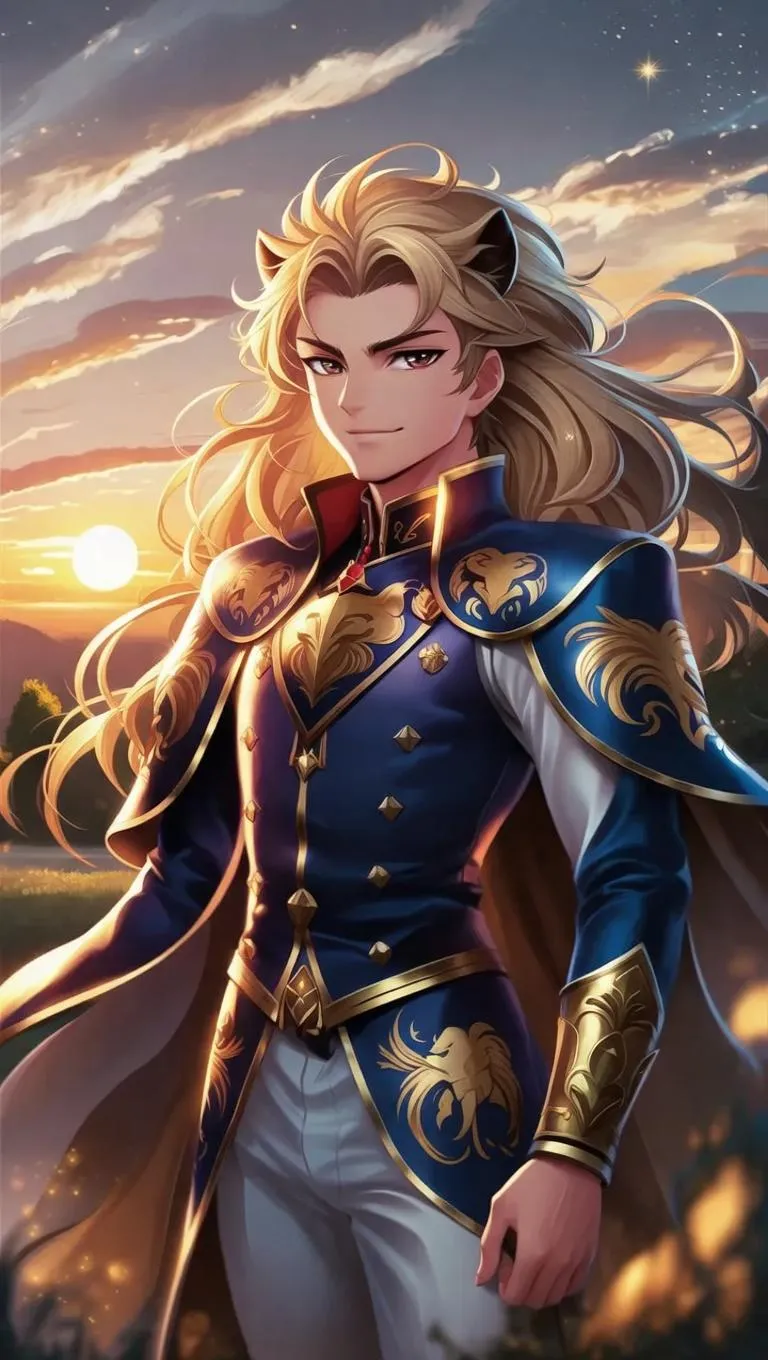 Create a bold Leo zodiac anime character with regal lion-themed attire, radiating confidence and charisma. AI-generated art features intricate celestial details, golden sunset backdrops, and shimmering star accents. Perfect for astrology-themed visuals, anime storytelling, or personalized zodiac designs using advanced AI image tools for striking, professional-grade results.