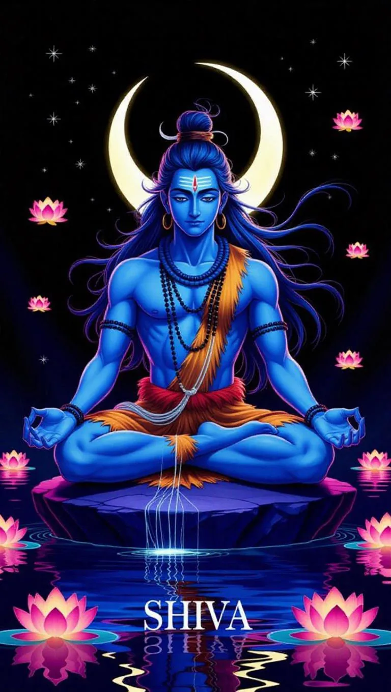 AI-generated anime art of Lord Shiva meditating on a floating rock in a mystical fantasy world. Features glowing lotus petals, divine watercolor textures, Ghibli-inspired Trishul, and pixelated spirits. Serene blue-skinned Shiva with flowing indigo hair, crescent moon, golden rudraksha beads, and dreamy pastel landscapes blending day/night skies. Ethereal sacred dreamscape merges anime artistry with digital effects for whimsical, spiritual visuals.