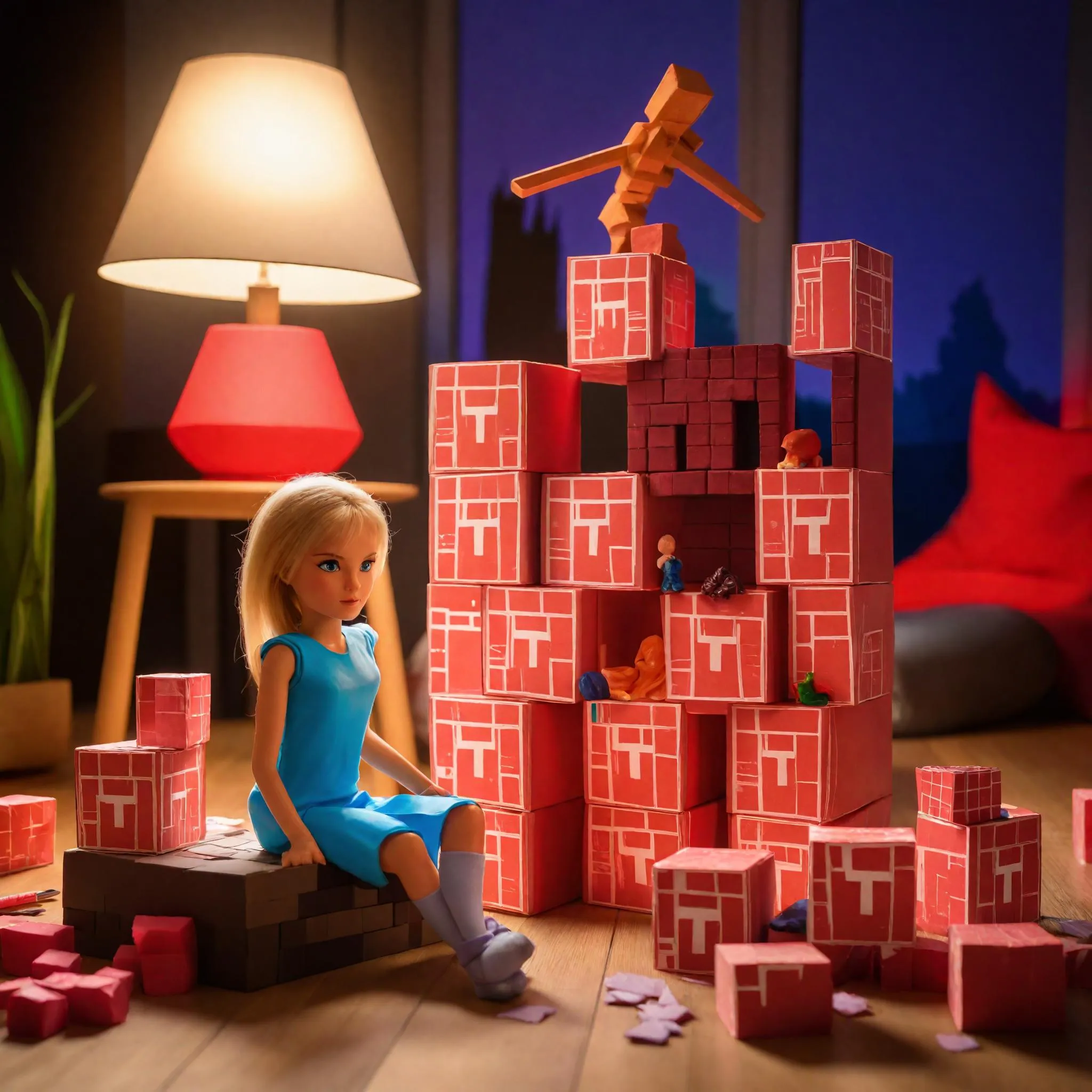 A photorealistic scene in a cozy child’s bedroom during late evening, lit only by a warm desk lamp. On the wooden floor stands a large toy house or castle built entirely from handmade paper blocks styled like Minecraft TNT — red paper cubes with hand-drawn 'TNT' labels, slightly crumpled edges showing childlike craft. At the top of the structure sits a Barbie doll in a sparkling pink dress, long blonde hair flowing as if guarding the tower. The 7-year-old boy in pajamas leans in close, holding a toy lighter. One of the paper TNT blocks has caught fire — small flames and bright sparks shoot out like a safe fireworks display. The boy’s face glows in the orange light, his eyes wide with awe. A faint trail of smoke rises into the air. The Barbie doll remains seated on top of the structure, catching some of the sparks. The mood is playful yet surprisingly dramatic, captured at child-eye level in hyperrealistic style.