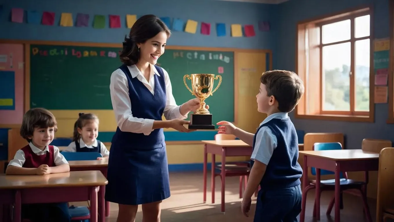 Generate AI-powered classroom scenes with a teacher awarding a 4-year-old child in a vibrant school setting. Create heartwarming educational moments using customizable AI visuals. Perfect for teachers, parents, and content creators. Professional-grade editing tools for lifelike details and seamless classroom imagery.