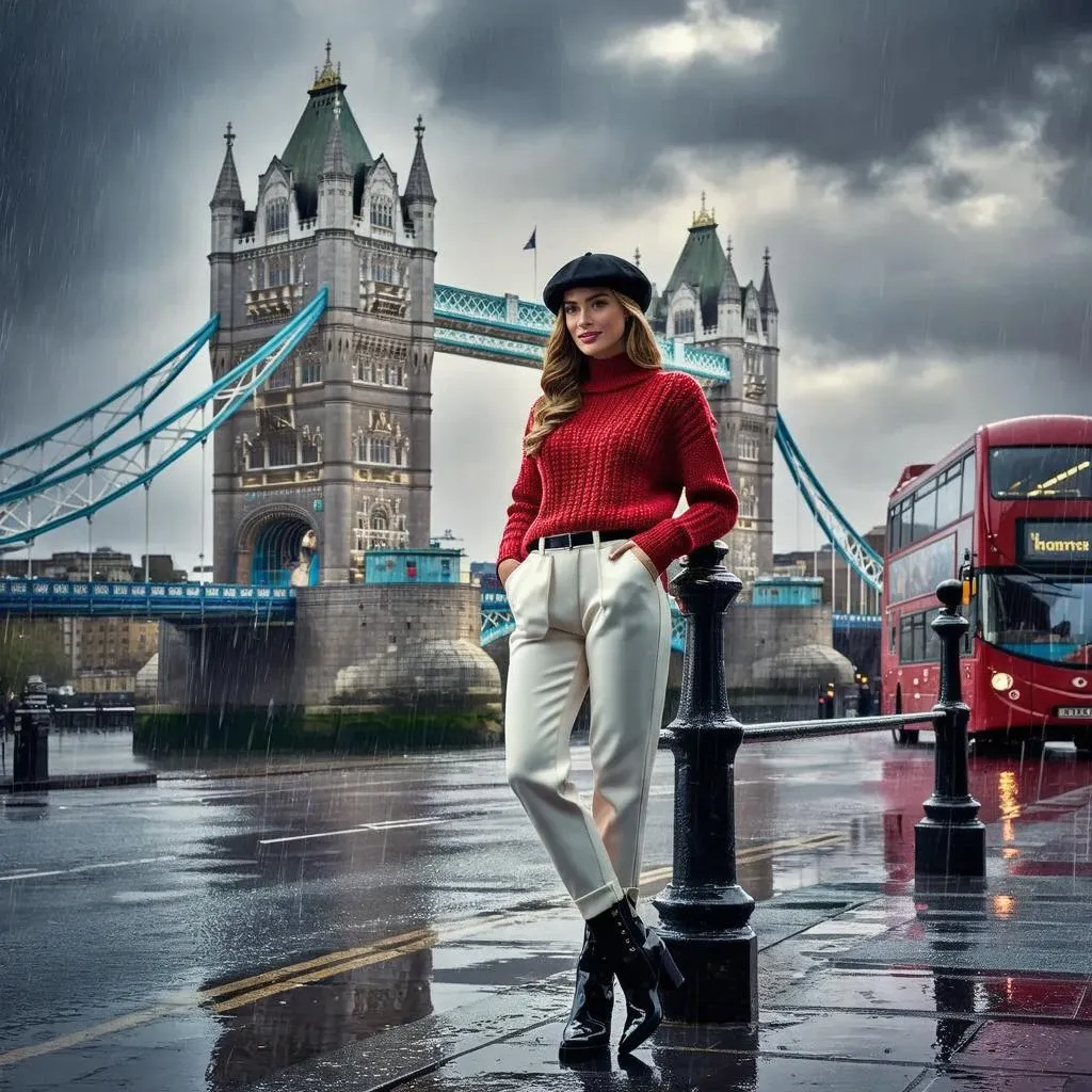 Capture cinematic AI-generated visuals of a fashionable woman in a red sweater posing on London Tower Bridge. Featuring a red double-decker bus, turquoise gothic architecture, and dramatic rainy-day lighting. Ideal for vibrant travel photography with high-resolution urban cityscapes and dynamic compositions.