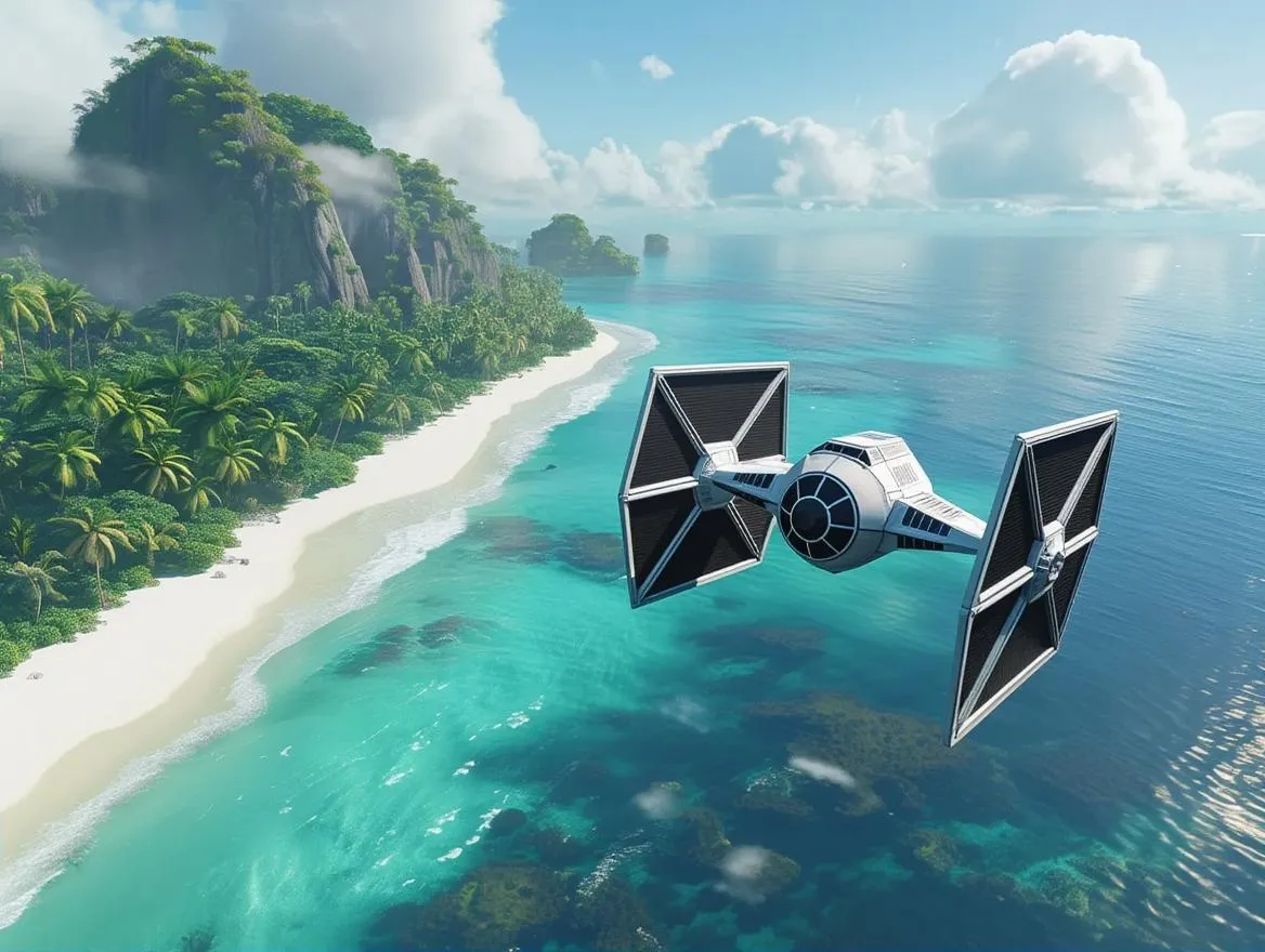 Generate a stunning aerial view of an Imperial TIE Fighter soaring 1000 meters above a lush tropical island with pristine white sand beaches and crystal-clear blue waters. Ultra-High Definition rendering and advanced texture mapping deliver vivid, dynamic visuals. Elevate your creative projects with AI-powered precision and cinematic detail from vivago.ai.
