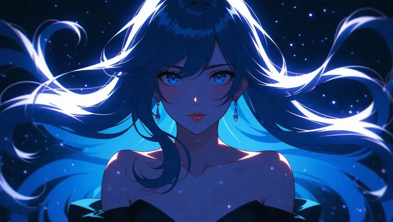 Stunning 2D cartoon AI art of a mysterious woman with flowing hair in a dark night scene. Features dynamic hair movement, soft blue lighting, captivating lake-like eyes, and subtle red-lipped allure. Dark-toned anime-style illustration with charming curves and atmospheric wind effects. Perfect AI-generated anime-inspired character illustration for digital art projects.