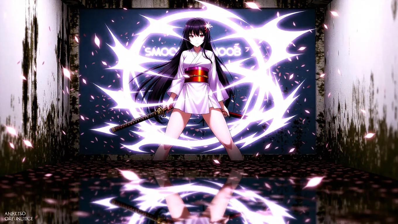 A mural on a weathered alley wall depicts: SmoothNoob_Quality, 1girl, solo, kimono, skimpy clothes, voluptuous body, katana, sword stance, unsheathing, detailed pupils, night, falling leaves, sword afterimage, glowing eyes, spark, geometric bodypaint, demonic energy, skindentation, powerful imagery, absurdres, best quality, extreme details, dynamic scene, very aesthetic, epic, volumetric lighting, real puddles mirror the scene, enhancing the illusion of movement, gentle and romantic anime style, soft greys and pale pinks, wet cement, dreamy, nostalgic atmosphere.