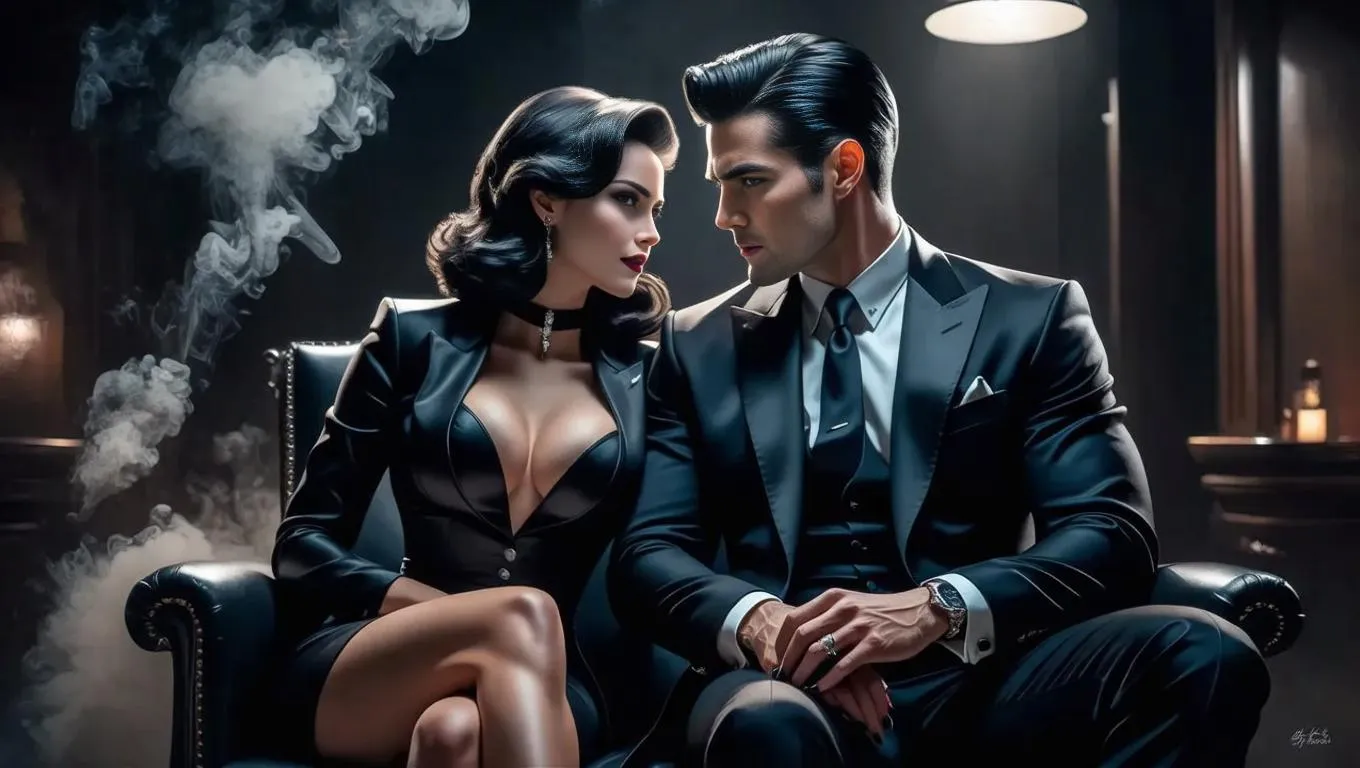 Create a striking AI-generated image of a mafia couple in black attire with dark hair, capturing their intense chemistry. This noir-inspired visual blends danger and sophistication, perfect for crime-themed storytelling. Transform text prompts into dramatic visuals using Vivago.ai's AI image generator and professional editing tools.