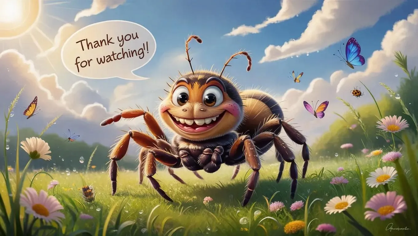 Generate a whimsical cartoon spider illustration with AI—cheerful arachnid strolls a vibrant meadow, waving a grateful leg amid sunny skies, blooming flowers, and playful sparkles. Perfect for lighthearted animations, greeting cards, or children's content. Vivago.ai transforms text into lively, friendly visuals with professional AI effects and creative customization.