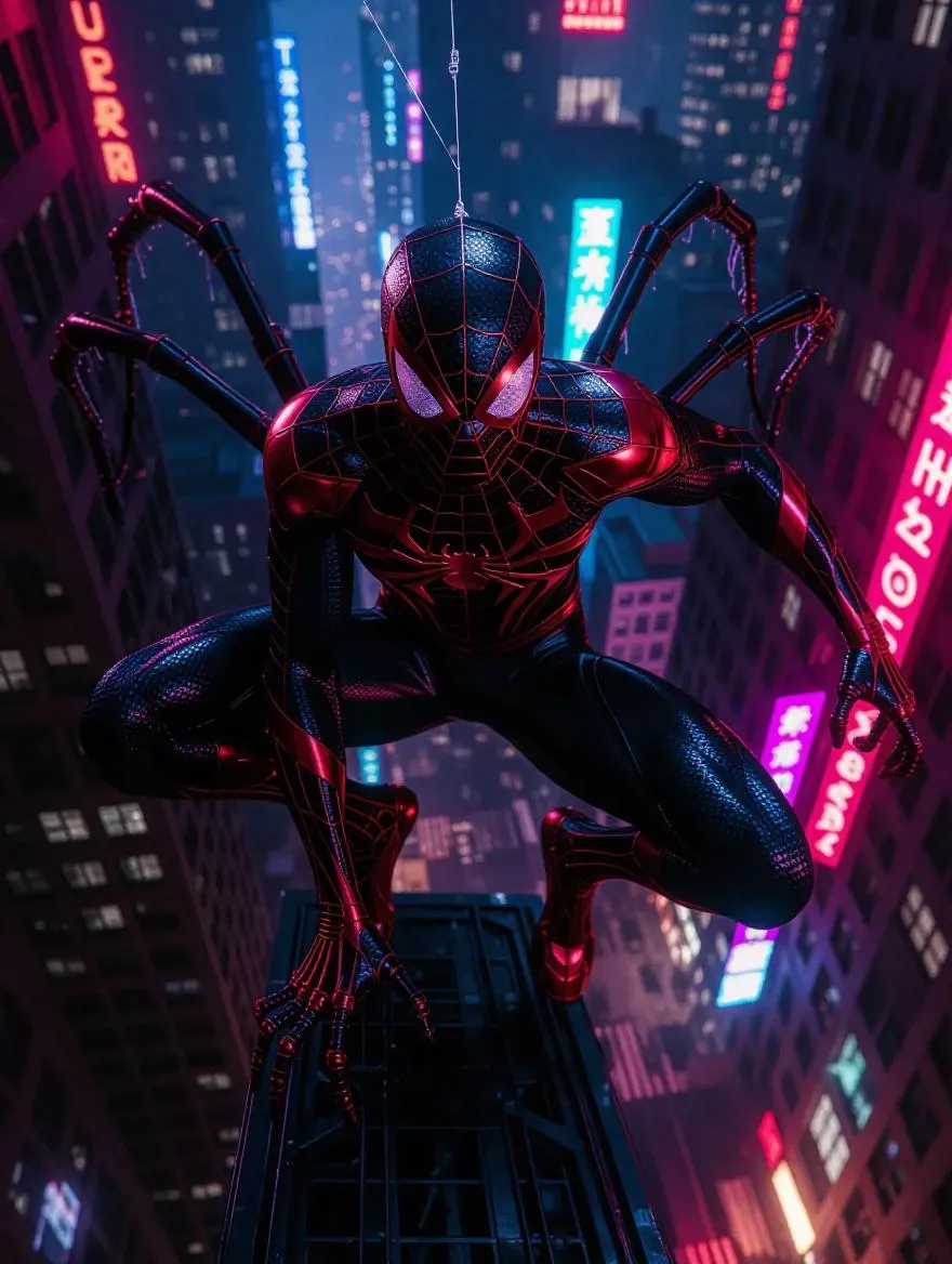 Biomech Spider-Man fused with his suit: glossy black exoskeleton, crimson pulsing armor plates, four whirring hydraulic legs erupting from his spine, anguished human head with glowing green veins from neural interface fluid. Perched atop a neon-drenched cyberpunk skyscraper, acid rain slashing across twitching mechanical limbs. Abdominal section sprouts organic spinnerets dripping corrosive webbing. Nightmarish blend of bleeding-edge tech and arachnid biology, backlit by holographic ads for forbidden body modifications.