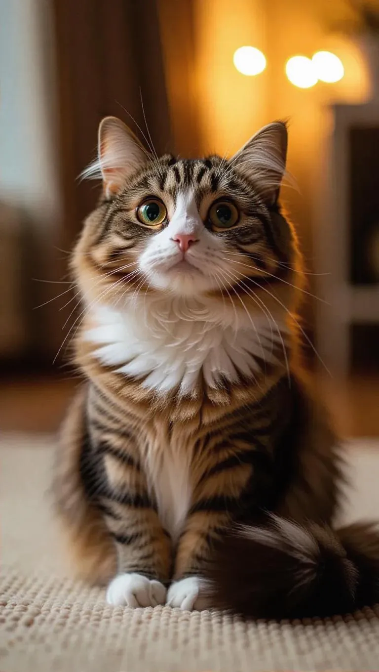 Generate a charming AI image of a cute cat with big expressive eyes and a fluffy tail, posed gracefully in a cozy indoor setting. Soft blurred background, warm lighting highlights fur texture, vertical 9:16 aspect ratio. Realistic yet whimsical style enhances feline charm. Perfect for social media or digital art—create stunning AI visuals effortlessly with VivaGo.ai.