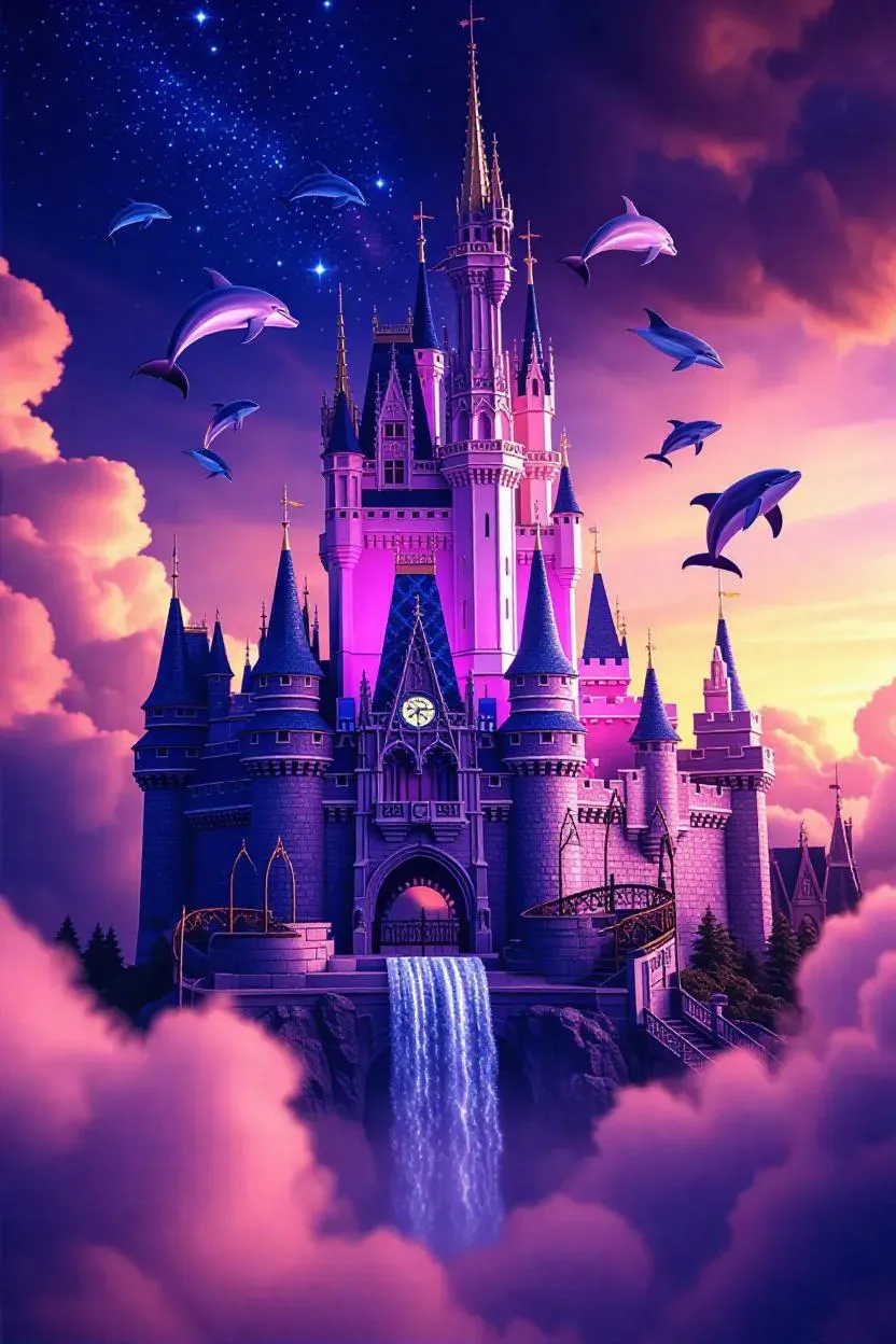 Enchanting AI-generated fantasy scene featuring a majestic floating castle with a cascading waterfall above cotton candy clouds, shimmering stars, and sparkling lights. Mystical dolphins, whales, and fish soar through the air. Transform your ideas into magical visuals with VivaGo.ai's AI art generator.