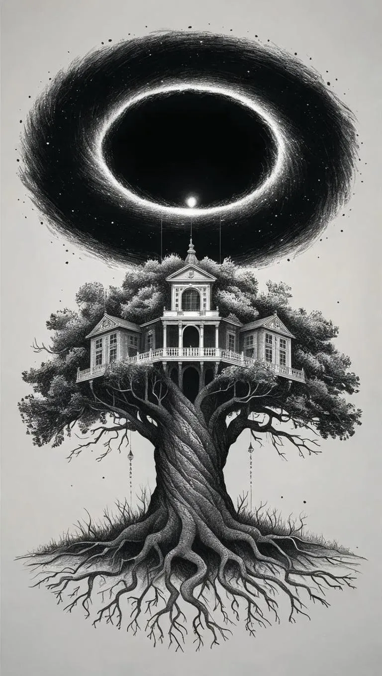 Create a custom tattoo design with a non-interactive black hole atop a central tree symbolizing new beginnings. Hand-drawn style blends with architectural sketching for intricate details. Use vivago.ai's AI tools to generate unique, professional-grade body art from text prompts. Perfect for symbolic ink designs with precise linework and artistic depth.