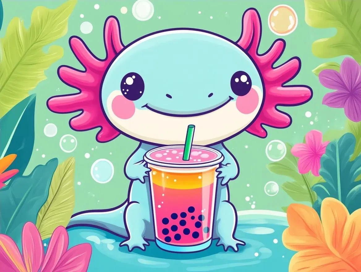 Generate a playful AI cartoon of a cute axolotl sipping boba tea, blending vibrant colors and whimsical character design. Elevate your creative projects with AI-generated, charming visuals for social media, animations, or digital art.