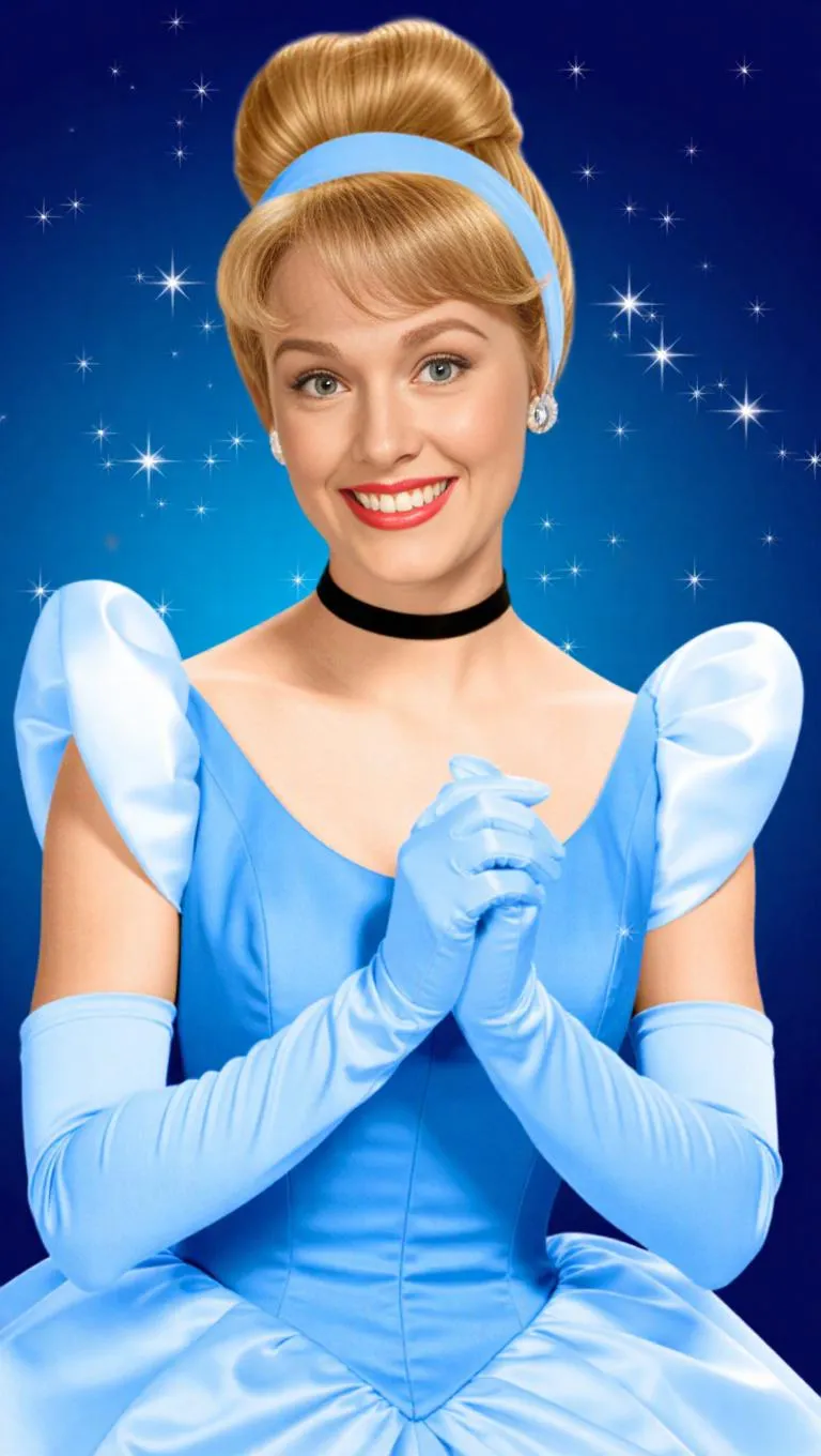 Kelly Vrooman as Cinderella (1950): Caucasian woman with a flowing yellow Cinderella wig adorned with a delicate blue hairband, elegant blue princess Cinderella dress, light blue gloves, black collar necklace, sparkling glass slippers, and a radiant smile.