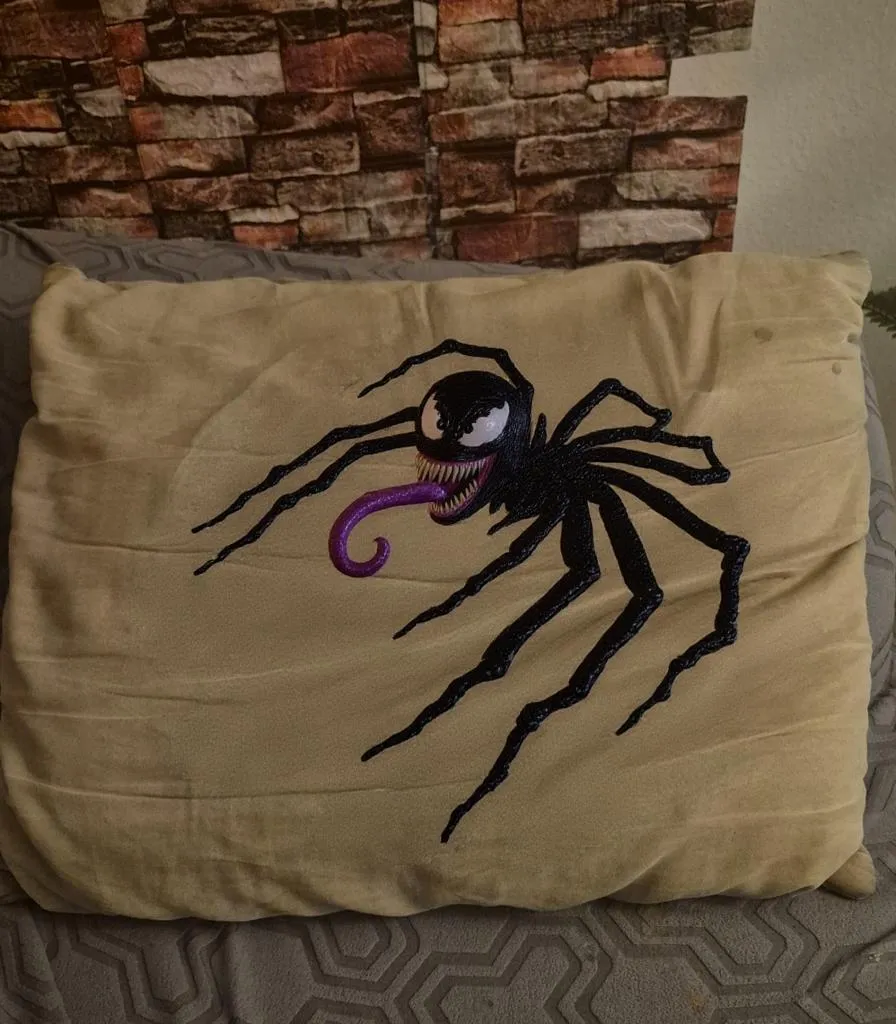 A sleek, menacing black and purple spider with glowing eyes and a long, curved tongue, extends its tongue to lick its shiny, black body. The spider's muscular legs and torso glisten under dark lighting, hinting at a soft, silky texture. The spider's position is slightly to the left, with its tongue reaching towards the right side of the frame. The background is dark and indistinct, putting the focus entirely on the spider.