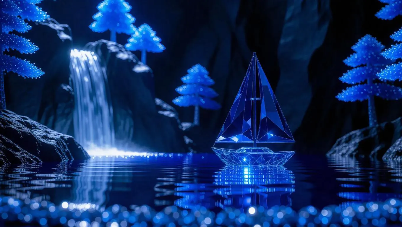 In blue lighting, a crystal waterfall drops diamonds into a crystal diamond lake, surrounded by crystal trees. A sapphire sailboat made of blue crystal leaves a trail of sparkling blue gemstones. Entire scene is made of crystals. Everything made of diamonds.