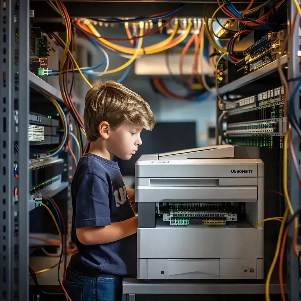 Generate a striking AI image of a boy amidst wires, gazing at a printer in a modern office. "USBoNET" dominates the foreground with Rule of Thirds composition. Explore vivago.ai's creative AI tools for professional-grade visuals, futuristic tech scenes, and dynamic visual storytelling.