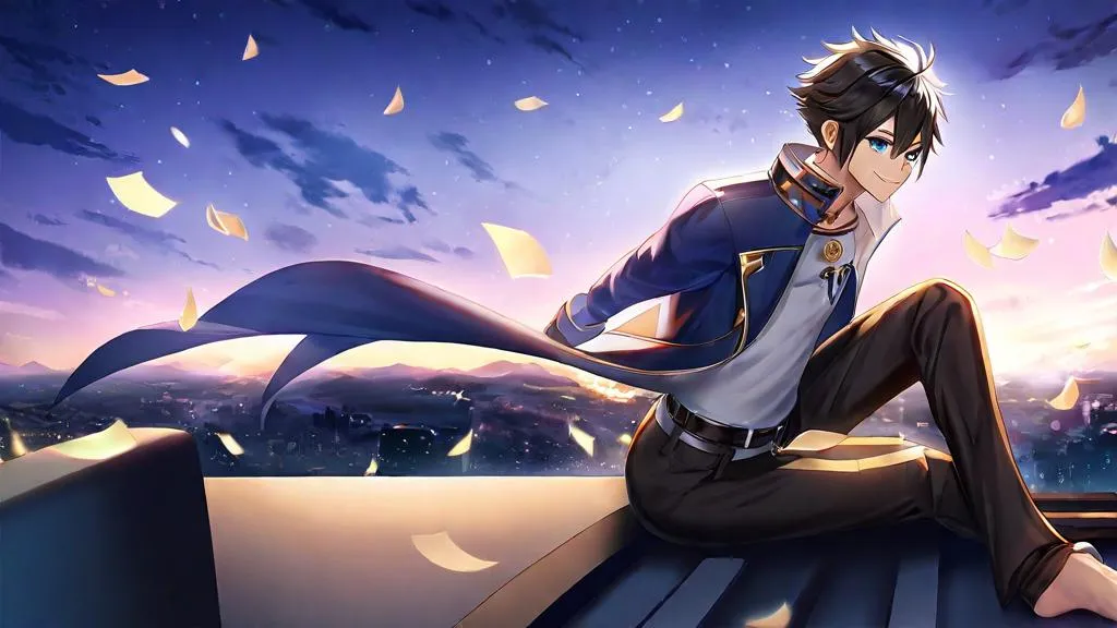 Create AI-generated anime art of Kaito on a sunset rooftop, blending serene reflection with vibrant cityscapes and floating music notes. Transform text prompts into visuals using vivago.ai's AI tools for symbolic imagery celebrating passion, freedom, and artistic journeys with professional-grade anime effects.