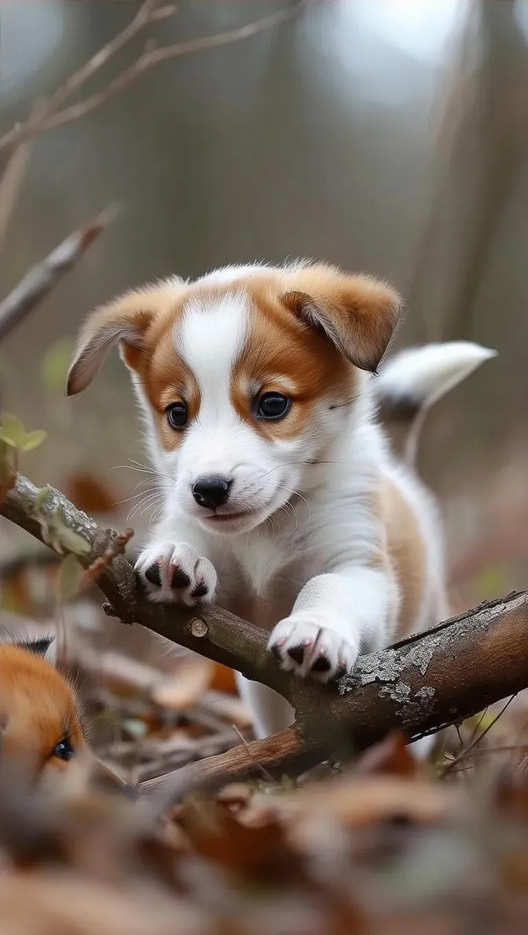 AI-generated image of a brave puppy with soft white fur rescuing an injured fox cub. Captures determination in brown eyes, urgent sniffing, and gentle nudging to free the cub. Perfect for storytelling, emotional wildlife scenes, or pet-themed projects. Use Vivago.ai's AI tools to create lifelike animal interactions, vivid textures, and heartwarming narratives. Ideal for illustrators, animators, or content creators.